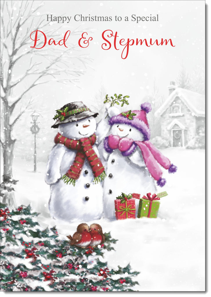 Dad & Stepmum Christmas Card Two Robins in Snow