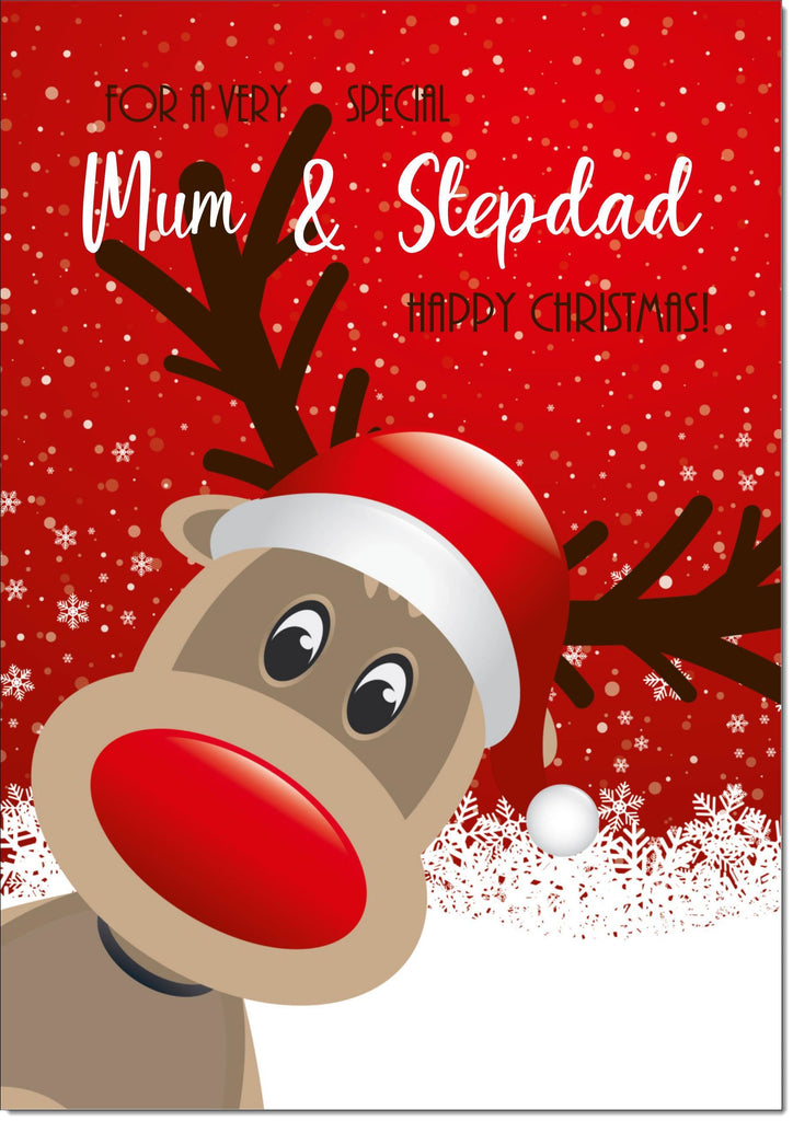 Mum & Stepdad Christmas Card Rudolph on Red Background