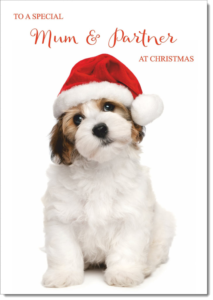 Dad & Partner Christmas Card Fluffy Dog in Santa Hat