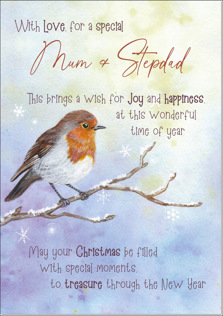 Mum & Stepdad Christmas Card Robin in Winter Scene