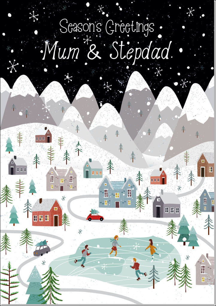 Mum & Stepdad Christmas Card Mountain Scene In Snowy Village