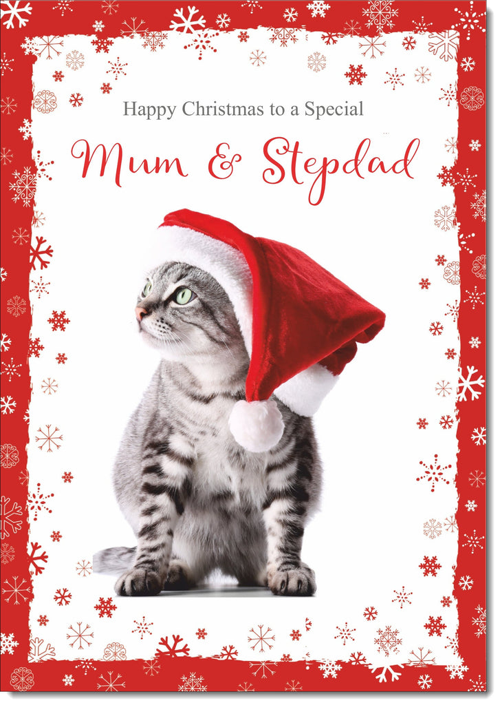 Mum & Stepdad Christmas Card Cat with Santa Hat