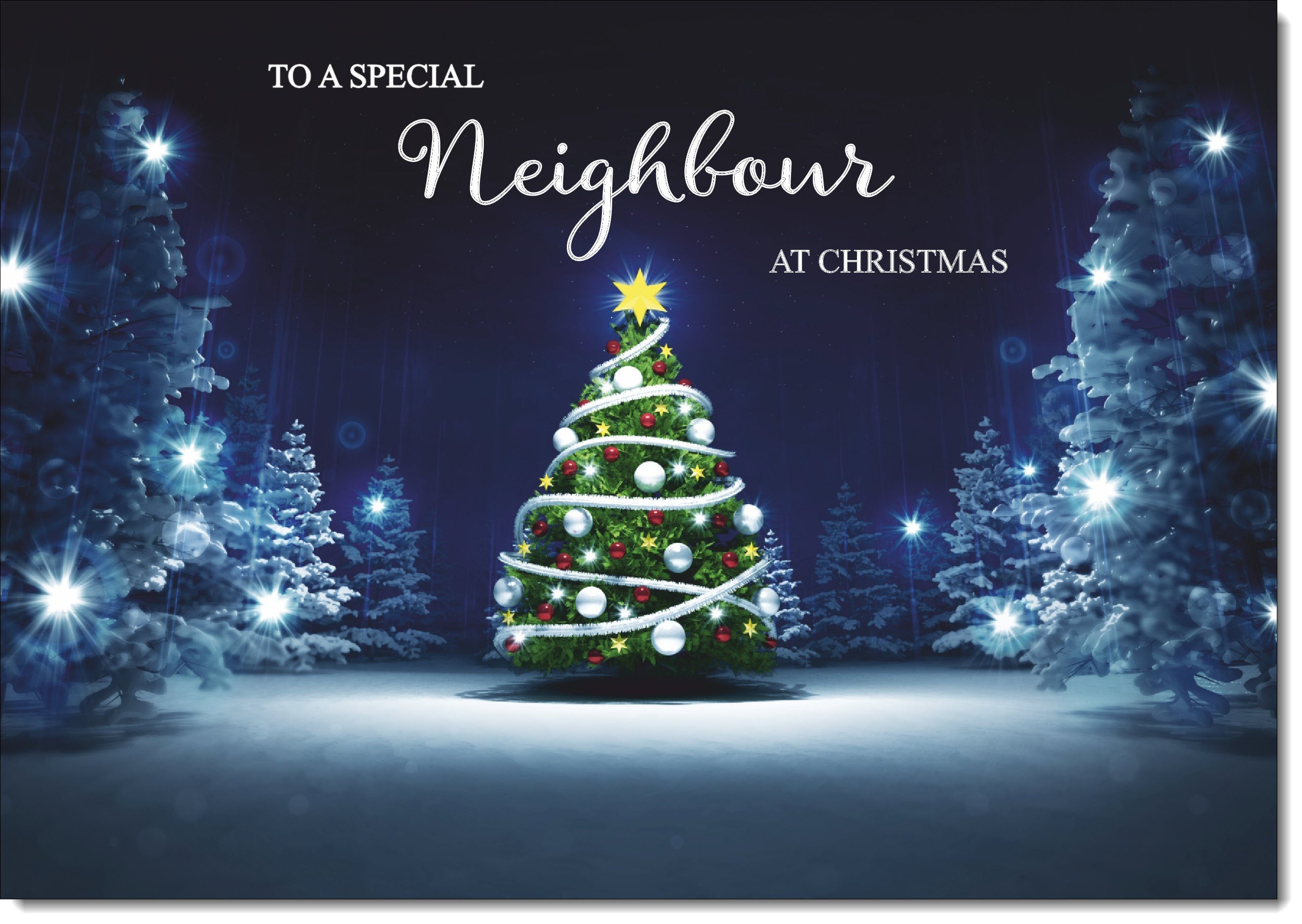 Neighbour Christmas Card Christmas Tree Lights in Dark Sky