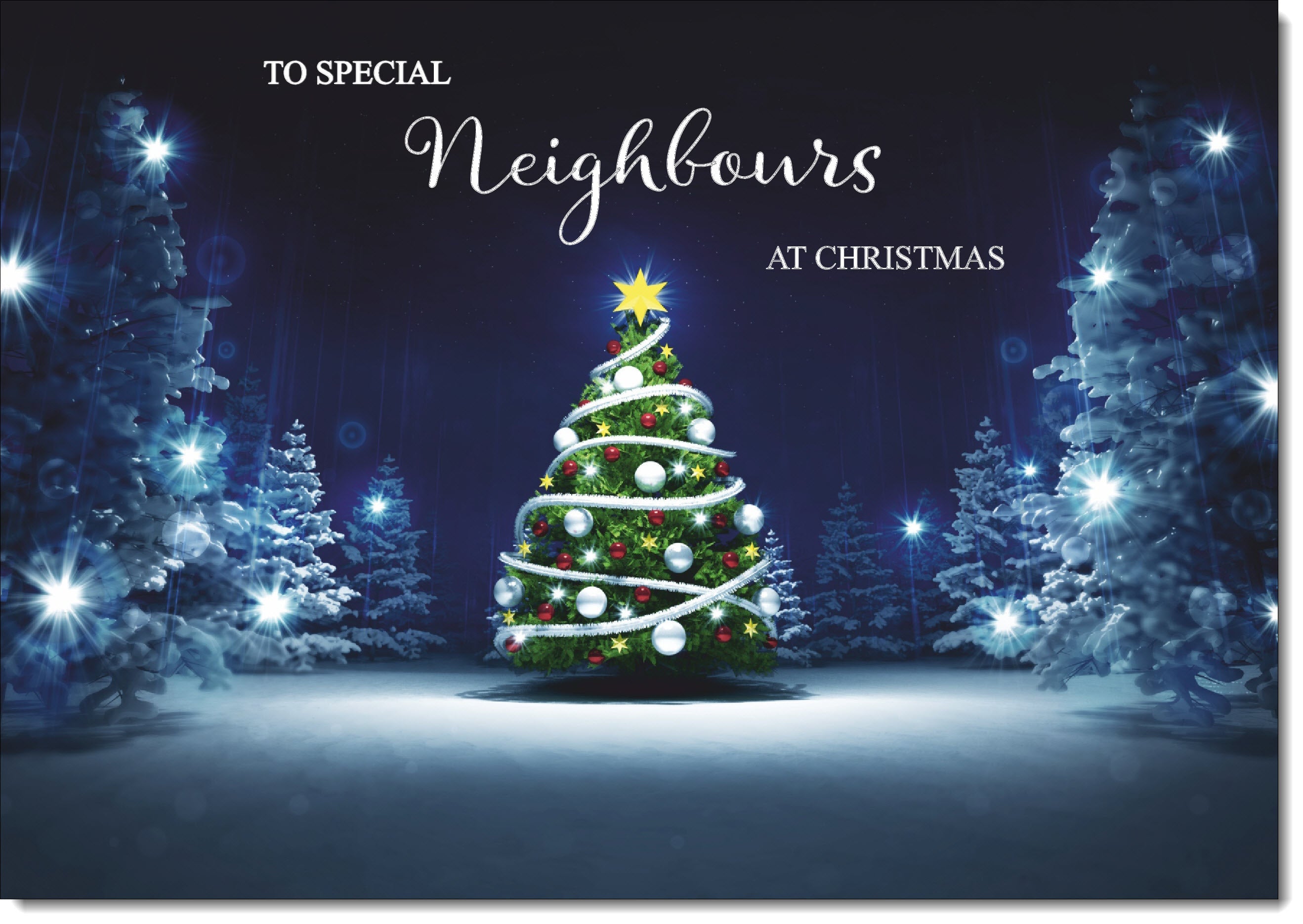 Neighbours Christmas Card Christmas Tree Lights in Dark Sky