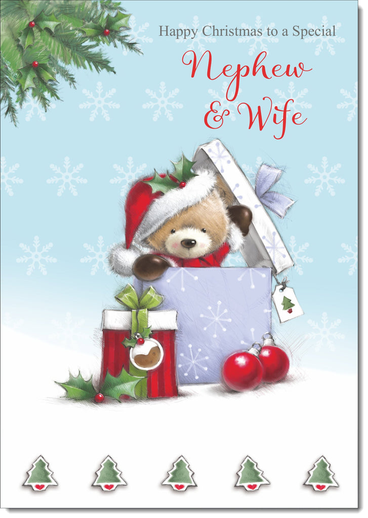 Nephew & Wife Christmas Card Cute Bear in Christmas Parcel