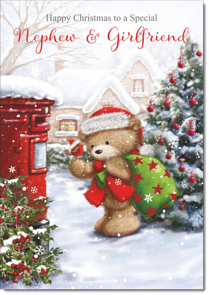 Nephew & Girlfriend Christmas Card Cute Bear at Post Box