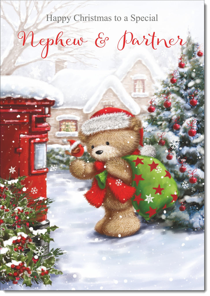 Nephew & Partner Christmas Card Cute Bear at Post Box