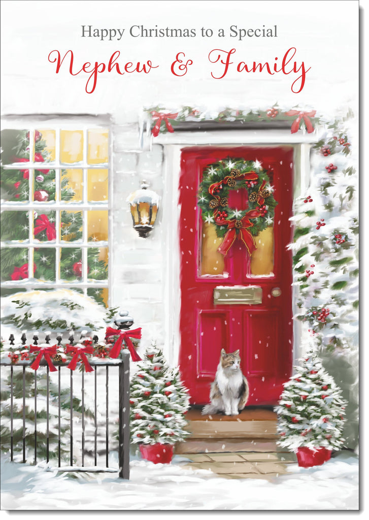 Nephew & Family Christmas Card Cat by Snowy Red Door