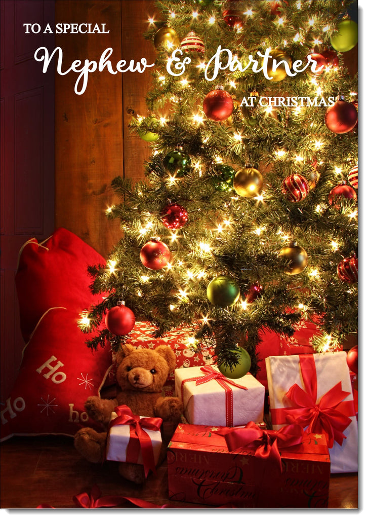 Nephew & Partner Christmas Card Teddy by Christmas Tree