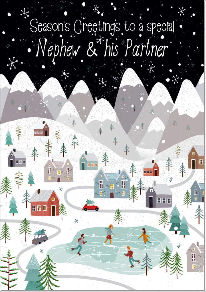 Nephew & Partner Christmas Card Mountain Scene In Snowy Village