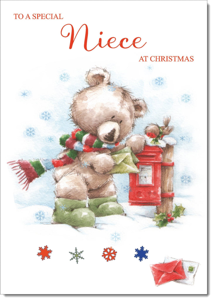 Niece Christmas Card Cute Bear in Christmas Parcel