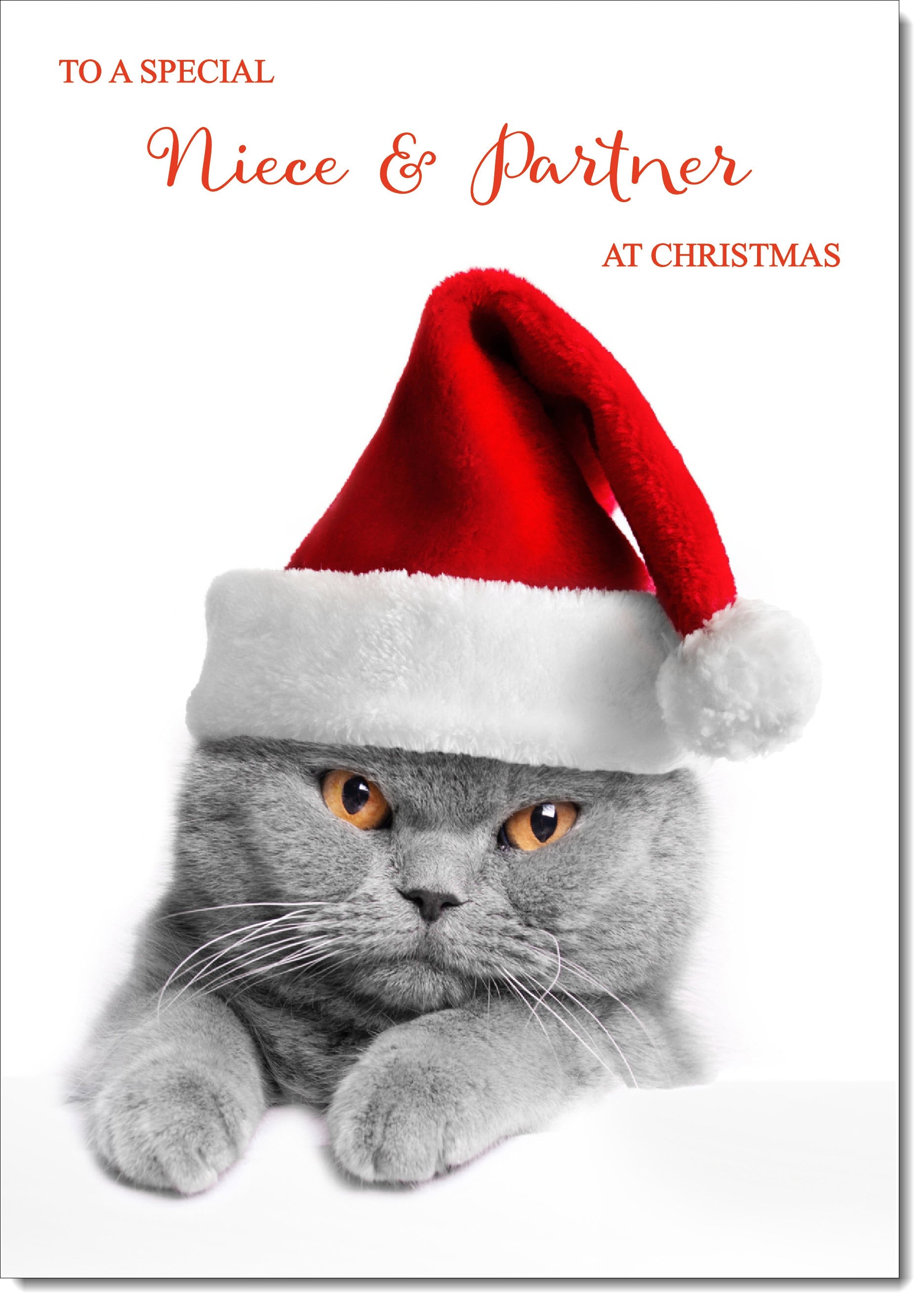 Niece & Partner Christmas Card Grey Cat with Santa Hat