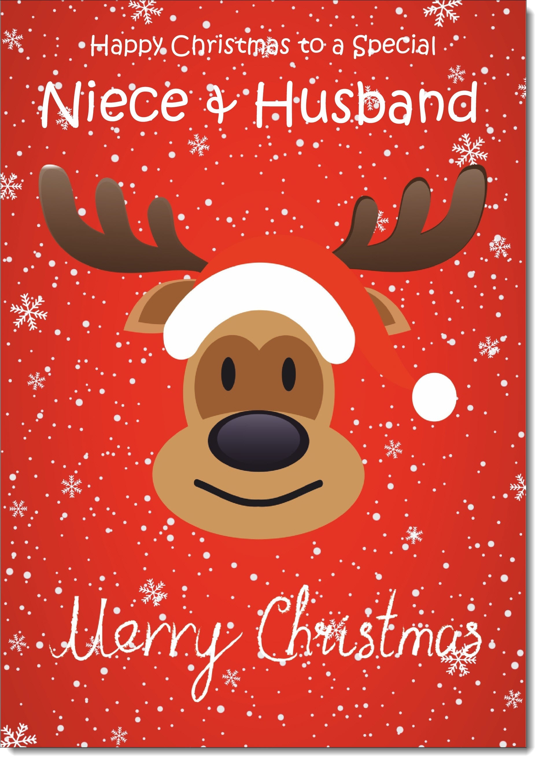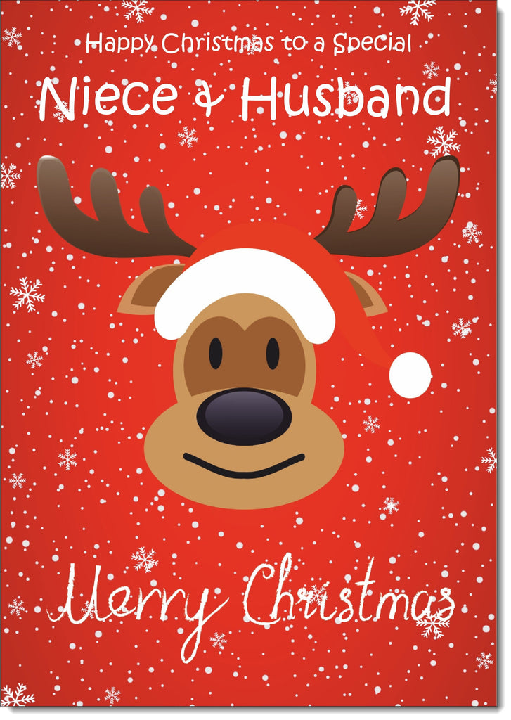 Niece & Husband Christmas Card Rudolph on Red Background