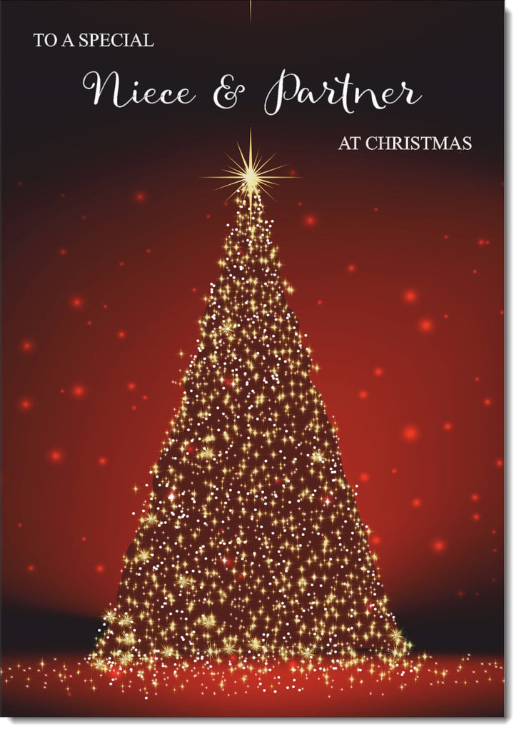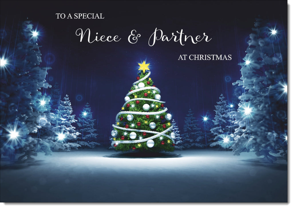 Niece & Partner Christmas Card Christmas Tree Lights in Dark Sky