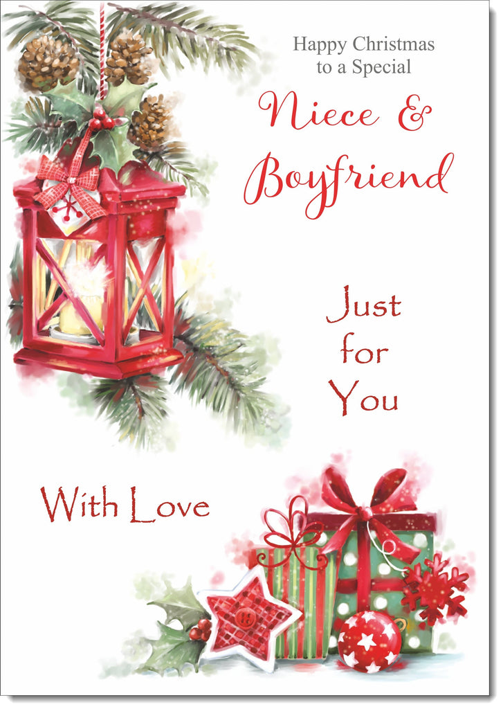 Niece & Boyfriend Christmas Card Red Lantern & Christmas Presents