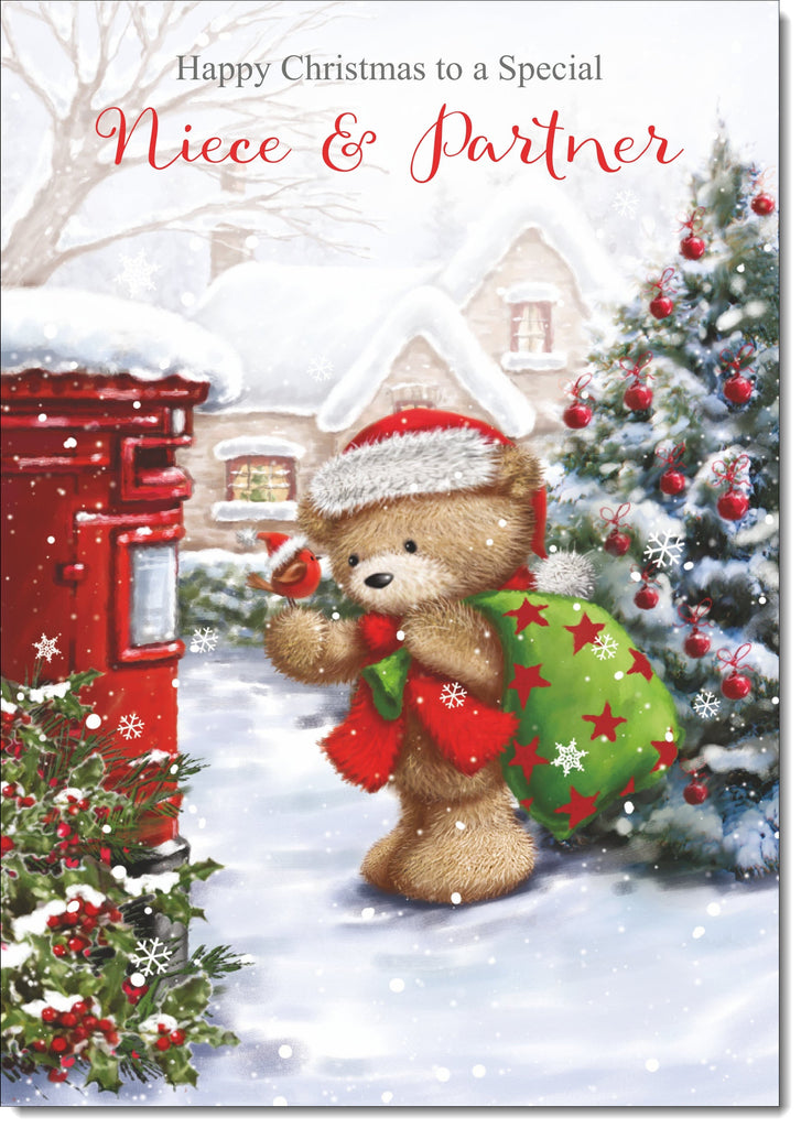 Niece & Partner Christmas Card Cute Bear at Post Box