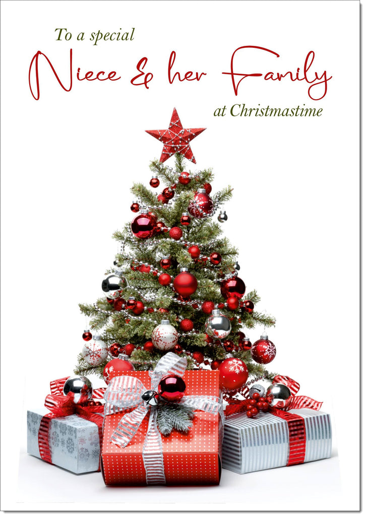 Niece & Family Christmas Card Christmas Tree and Parcels