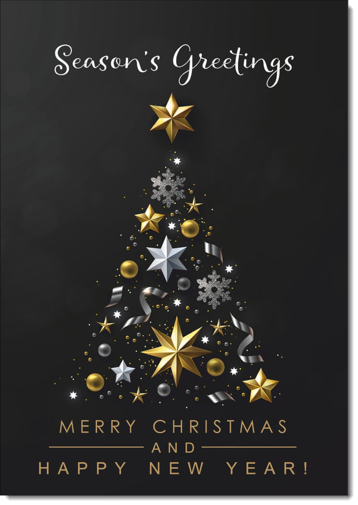 Seasons Greetings Christmas Card Black and Gold Abstract Tree