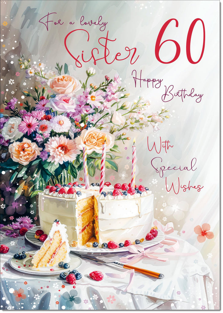 Sister 60th Birthday Card Age 60 Birthday Cake and Flowers