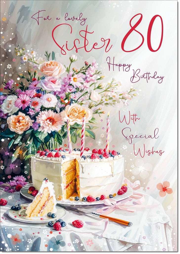 Sister 80th Birthday Card Age 80 Birthday Cake and Flowers