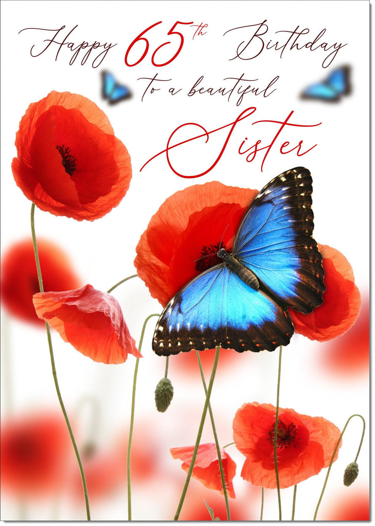 Sister 65th Birthday Card Age 65 Poppies and Blue Butterflies