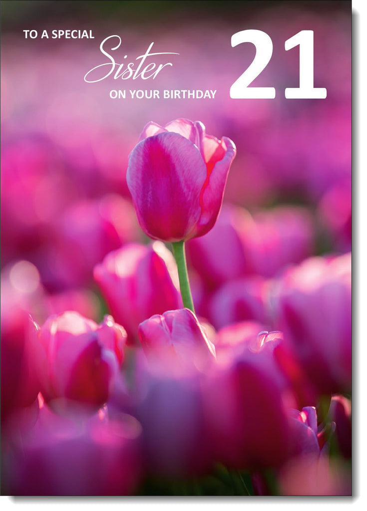 Sister 21st Birthday Card Age 21 Pink Tulip Field