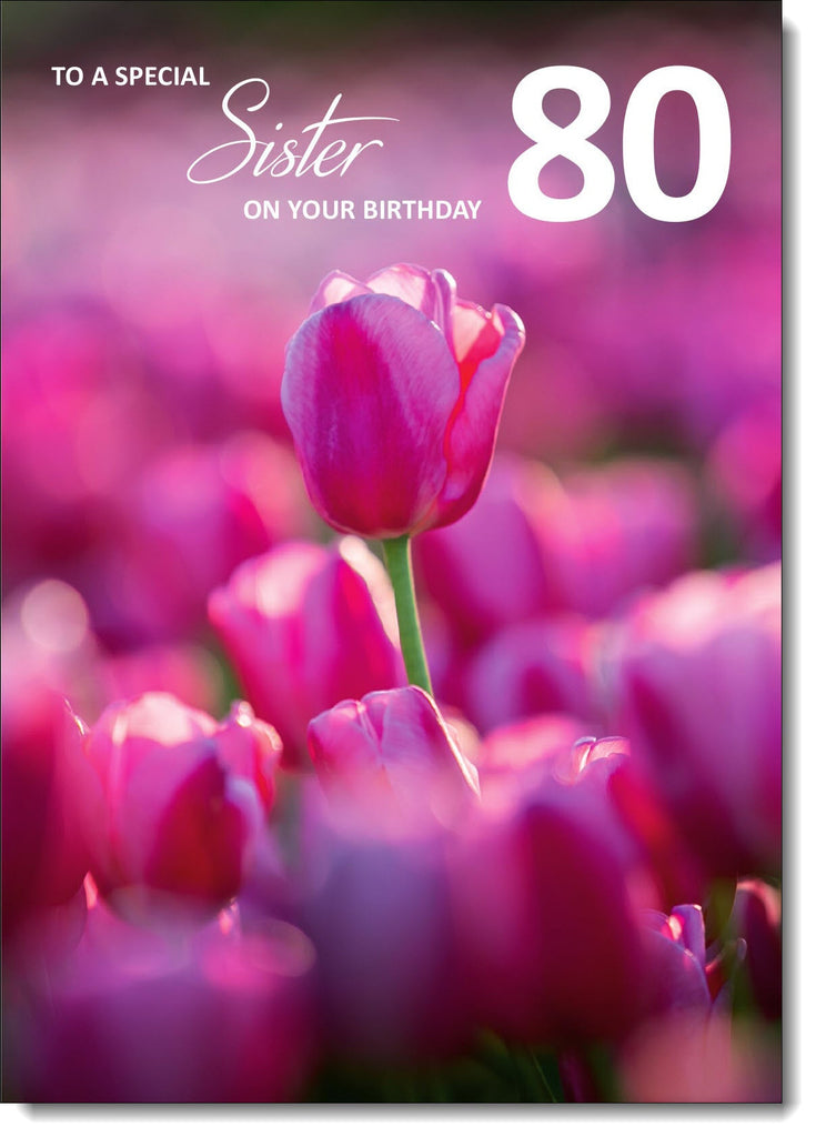 Sister 80th Birthday Card Age 80 Pink Tulip Field