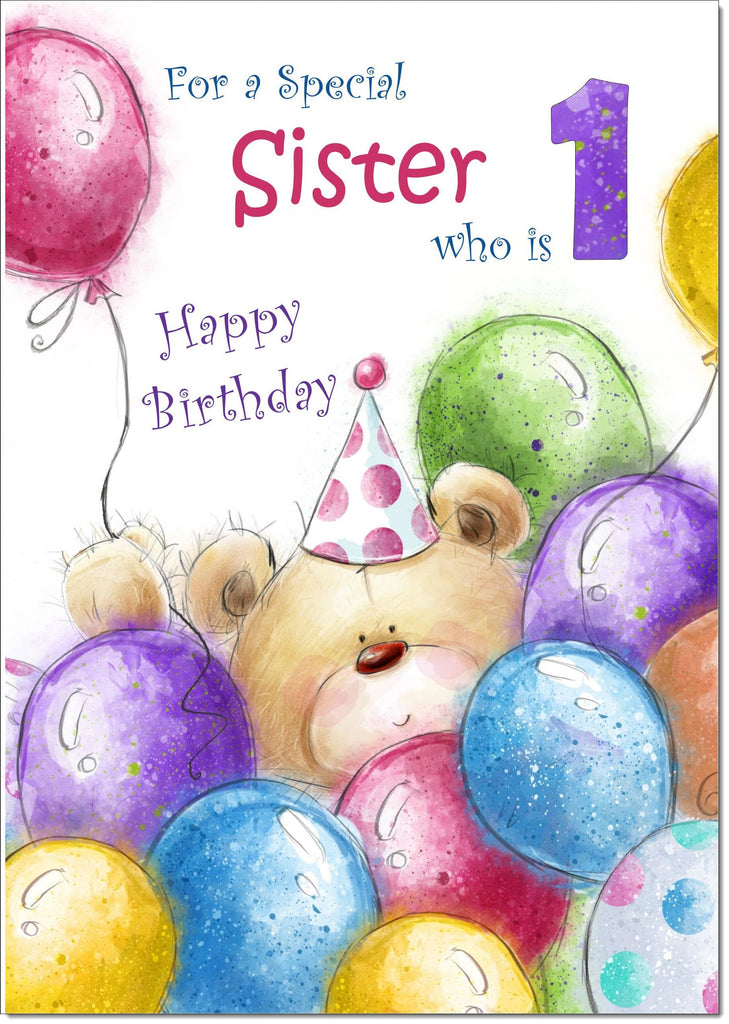 Sister 1st Birthday Card Age 1 Cute Teddy Bear in Balloons