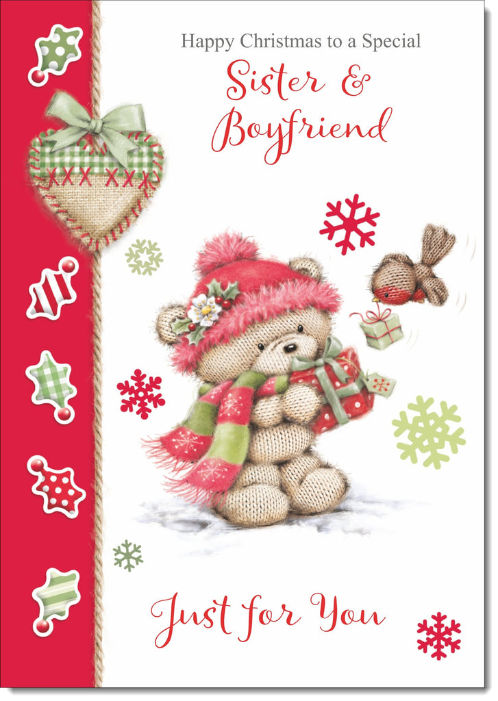 Sister & Boyfriend Christmas Card Cute Bear in Pink Bobble Hat