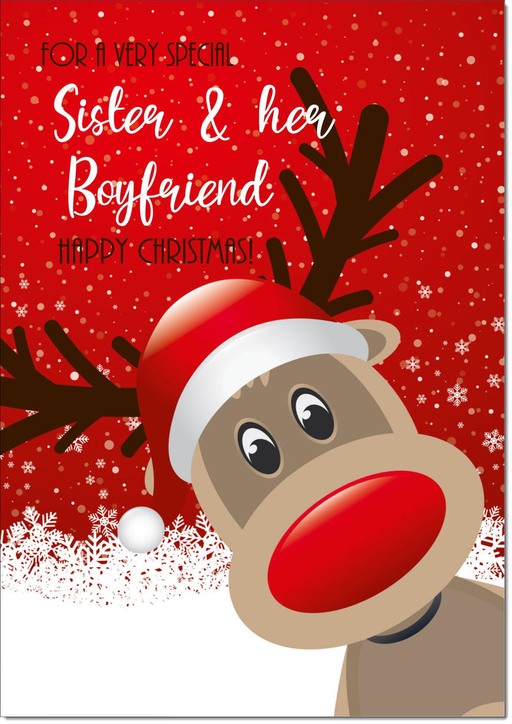 Sister & Boyfriend Christmas Card Rudolph on Red Background