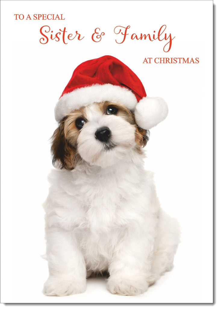 Sister & Fiance Christmas Card Fluffy Dog in Santa Hat