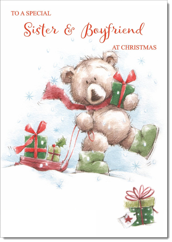 Sister & Boyfriend Christmas Card Cute Bear with Sled