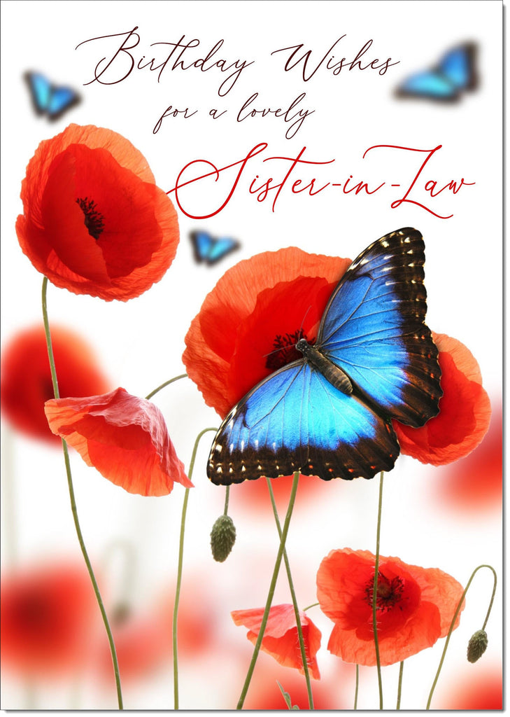 Sister-in-Law Birthday Card Poppies and Blue Butterflies