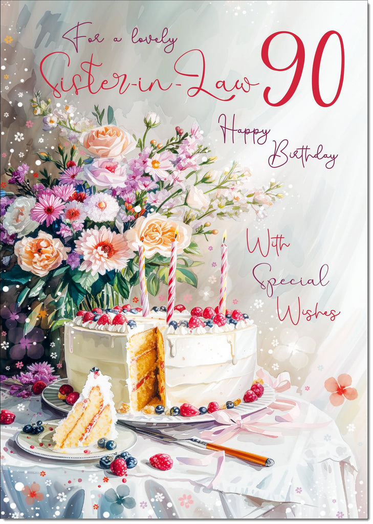 Sister-in-Law 90th Birthday Card Age 90 Birthday Cake and Flowers