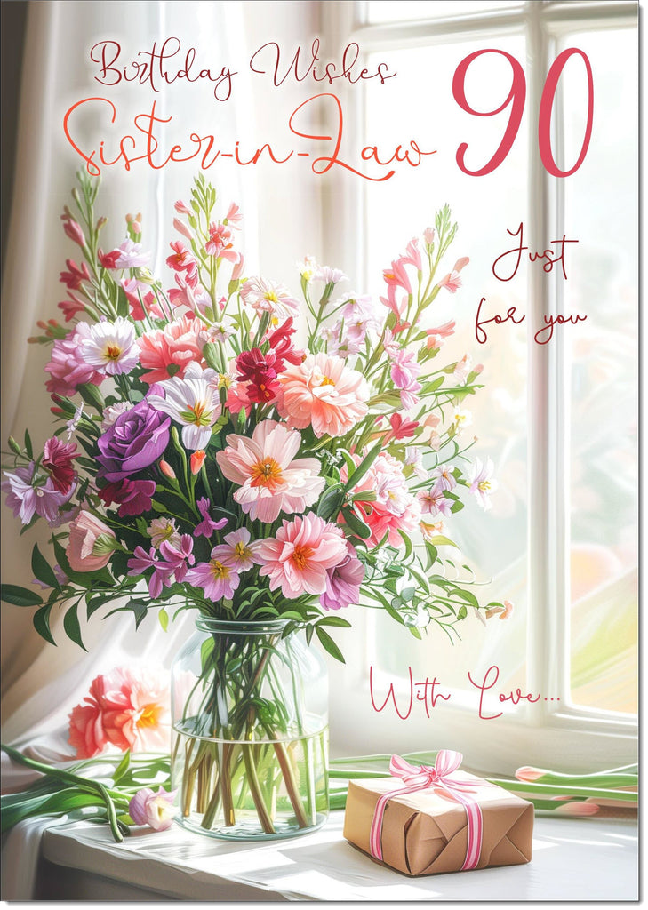 Sister-in-Law 90th Birthday Card Age 90 Flower Bouquet and Present