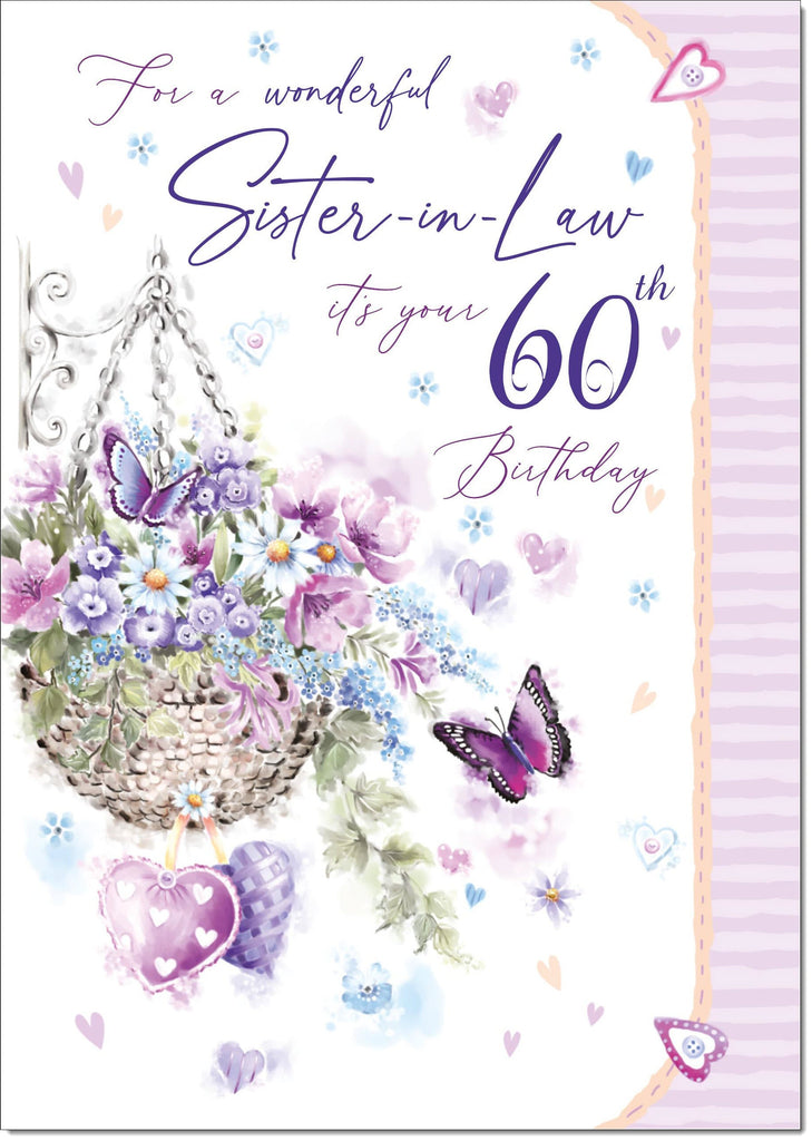 Sister-in-Law 60th Birthday Card Age 60 Purple Hanging Basket