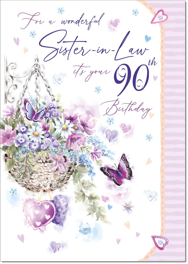 Sister-in-Law 90th Birthday Card Age 90 Purple Hanging Basket