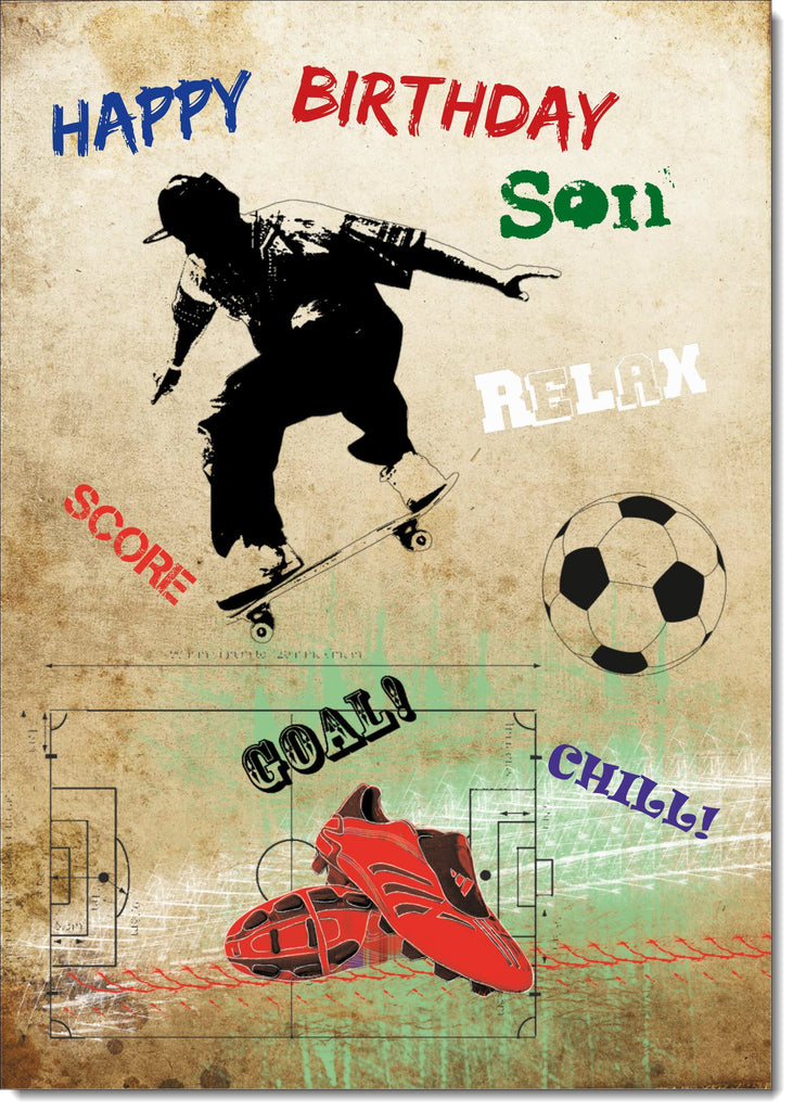 Son Birthday Card Football and Skateboarding