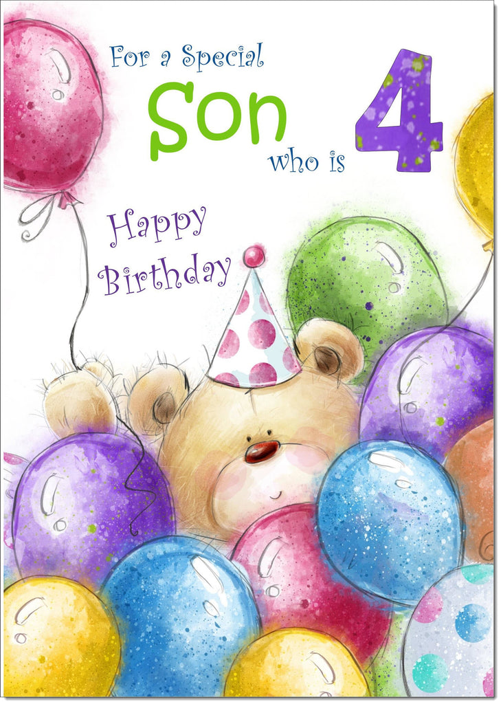 Son 4th Birthday Card Age 4 Cute Teddy Bear in Balloons