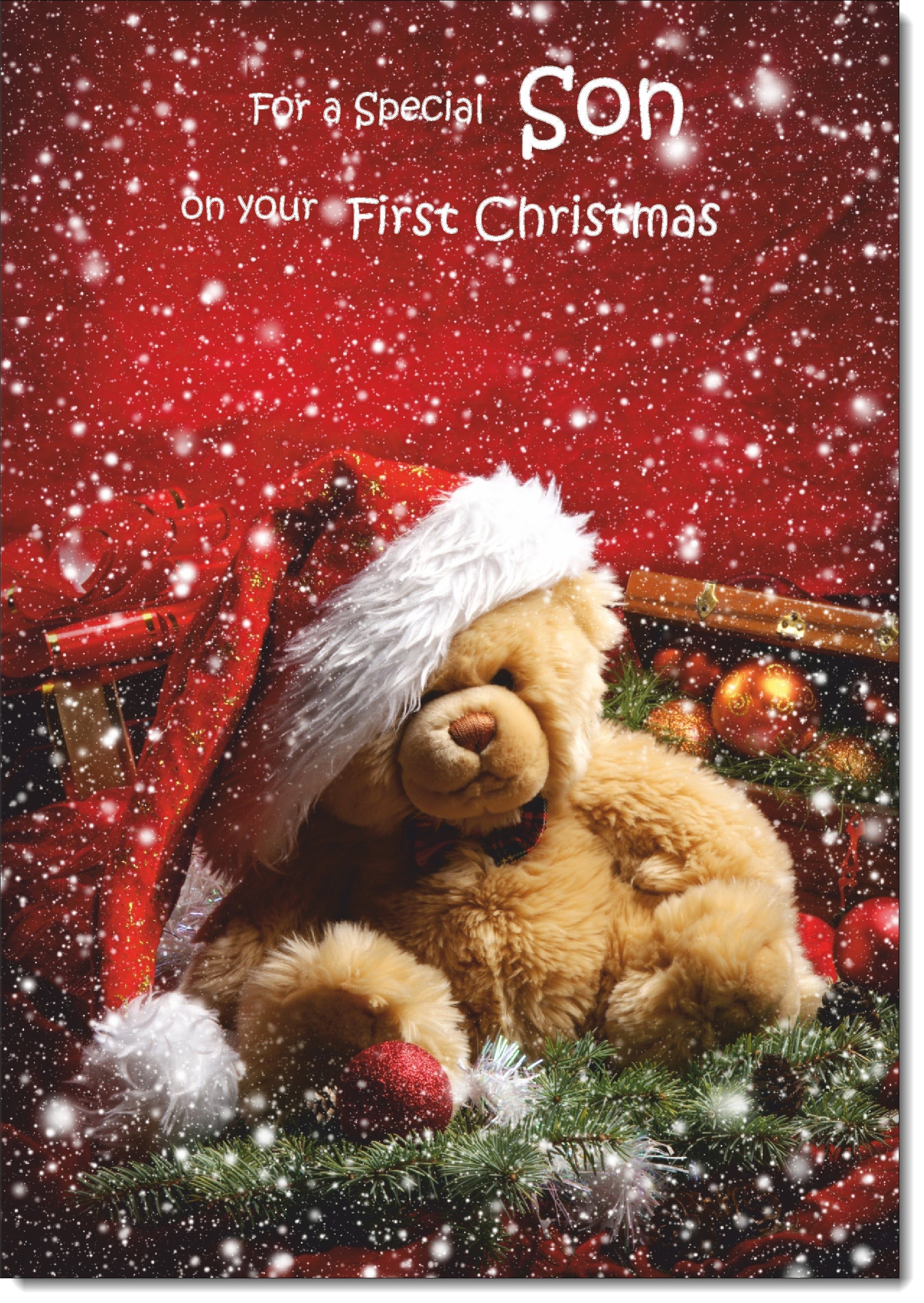 Sons 1st Christmas Card Teddy Bear in Santa Hat