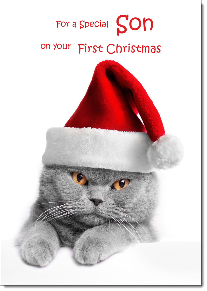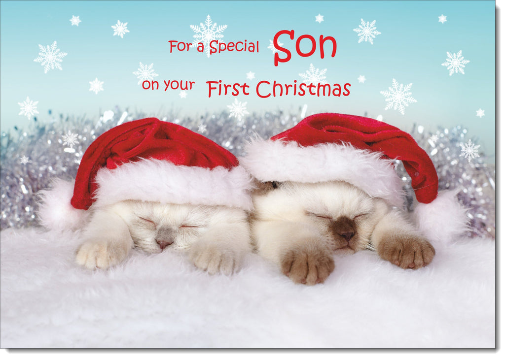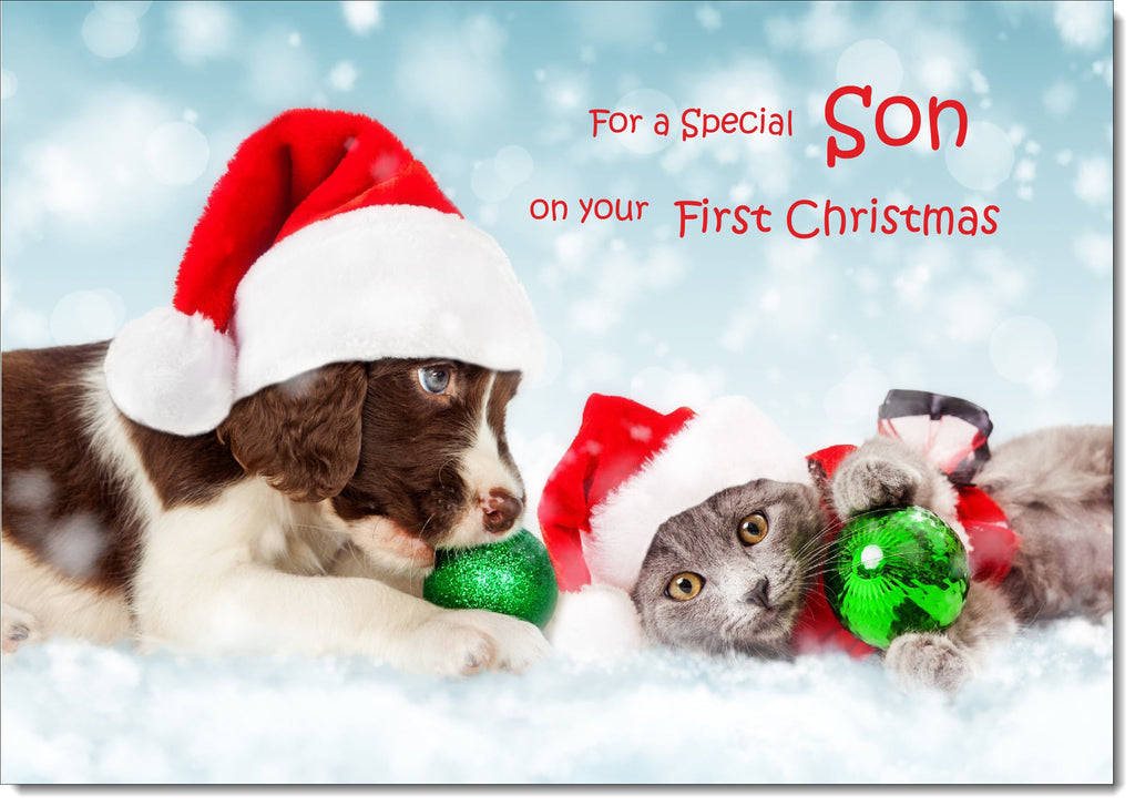 Sons 1st Christmas Card Puppy and Kitten with Santa Hats
