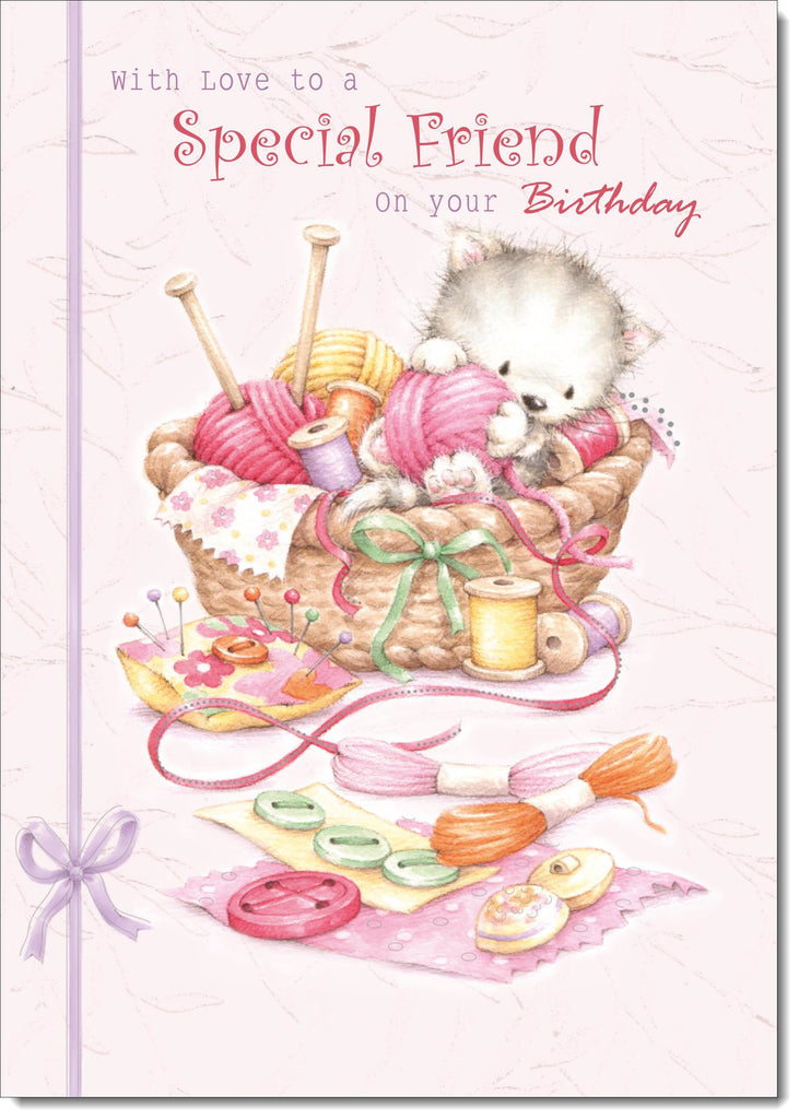 Special Friend Birthday Card Kitten in Sewing Basket