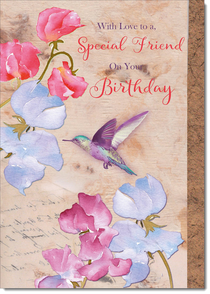 Special Friend Birthday Card Sweet Pea and Hummingbirds