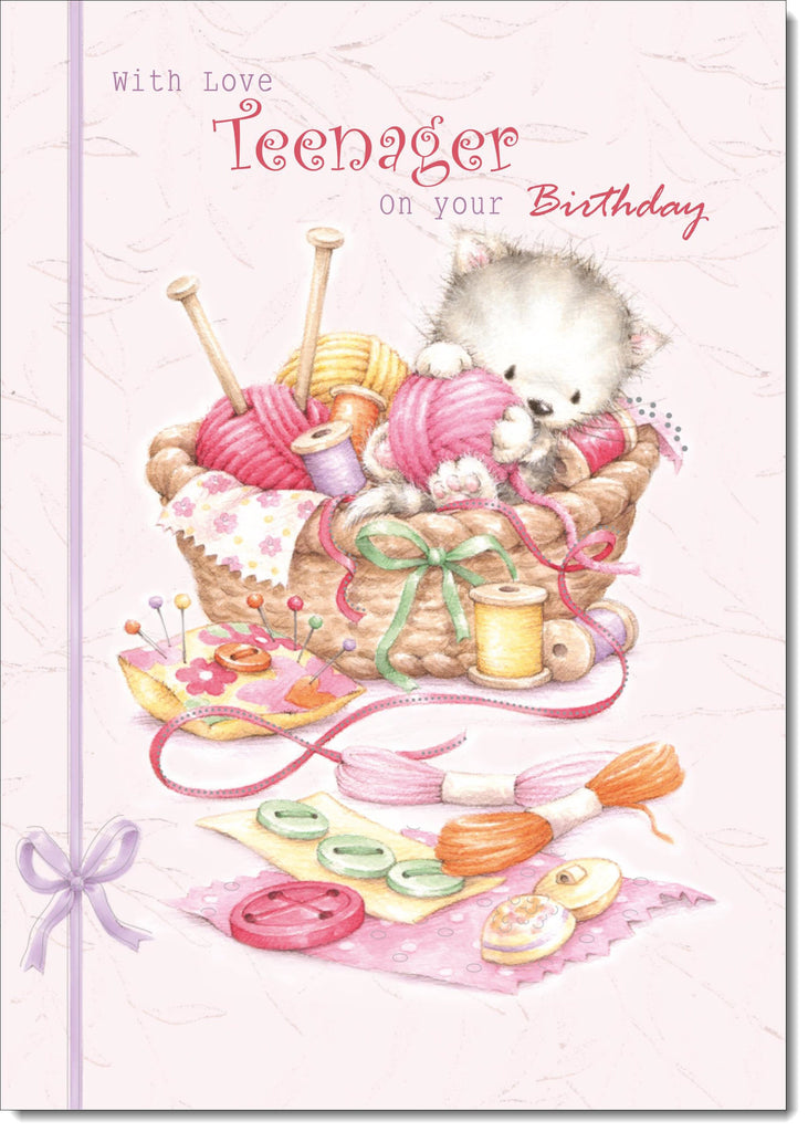 Teenager Birthday Card for Boy Kitten in Sewing Basket