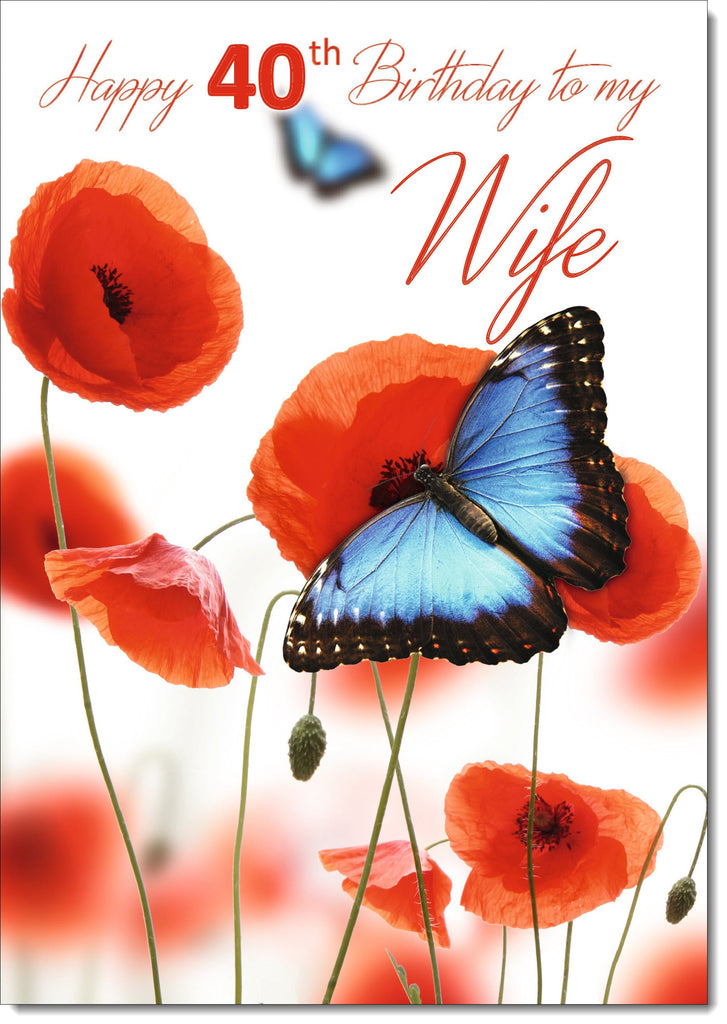 Wife 40th Birthday Card Age 40 Poppies and Blue Butterflies