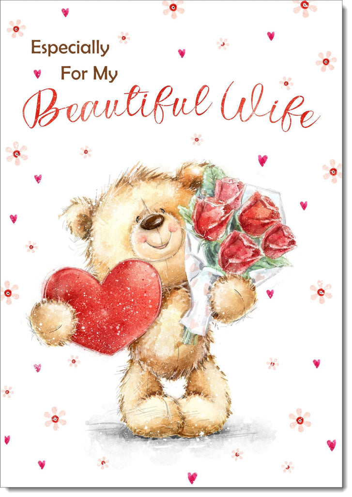 Wife Birthday Card Teddy with Love Heart and Flowers