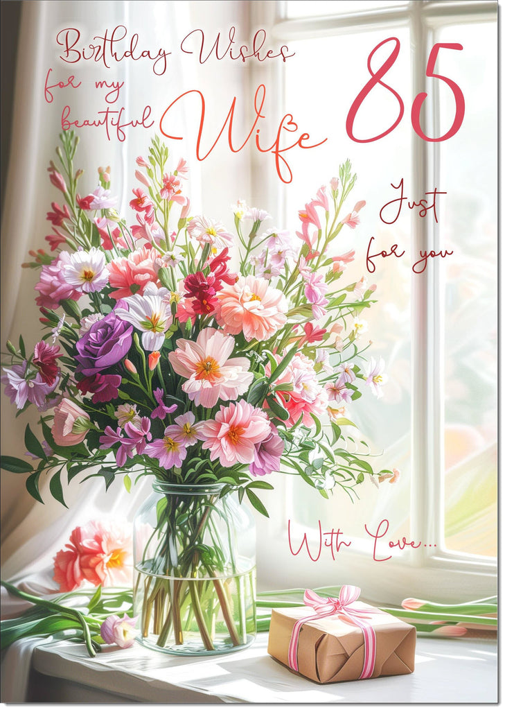 Wife 85th Birthday Card Age 85 Flower Bouquet and Present