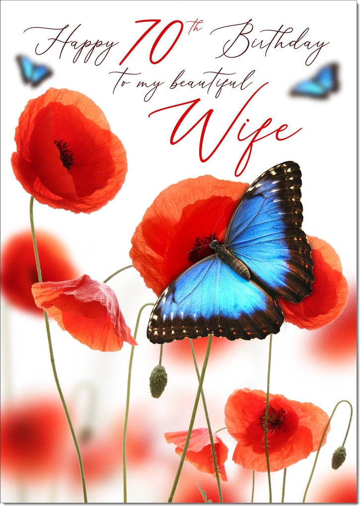 Wife 70th Birthday Card Age 70 Poppies and Blue Butterflies