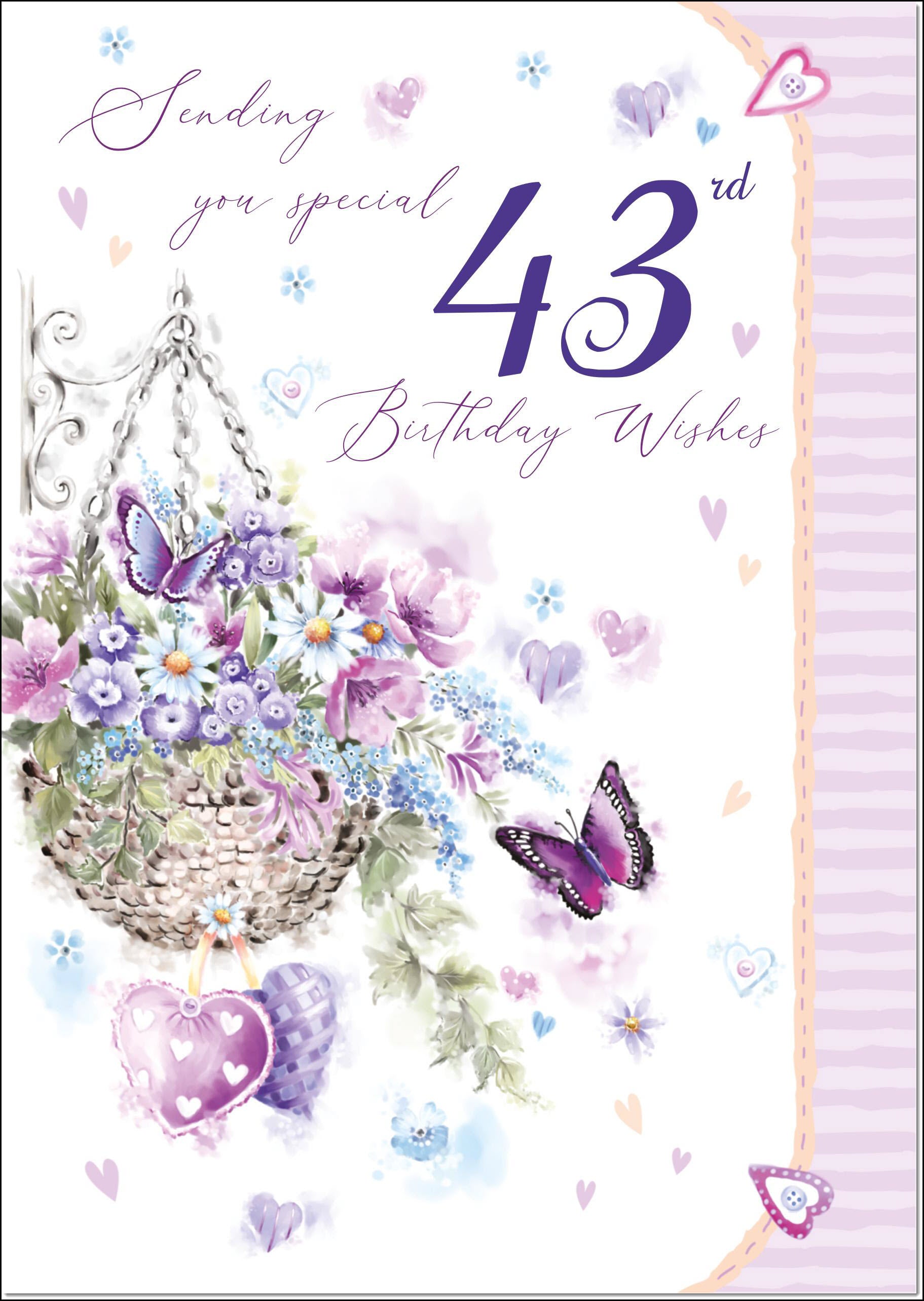 43rd Birthday Card Age 43 for Her Purple Hanging Basket