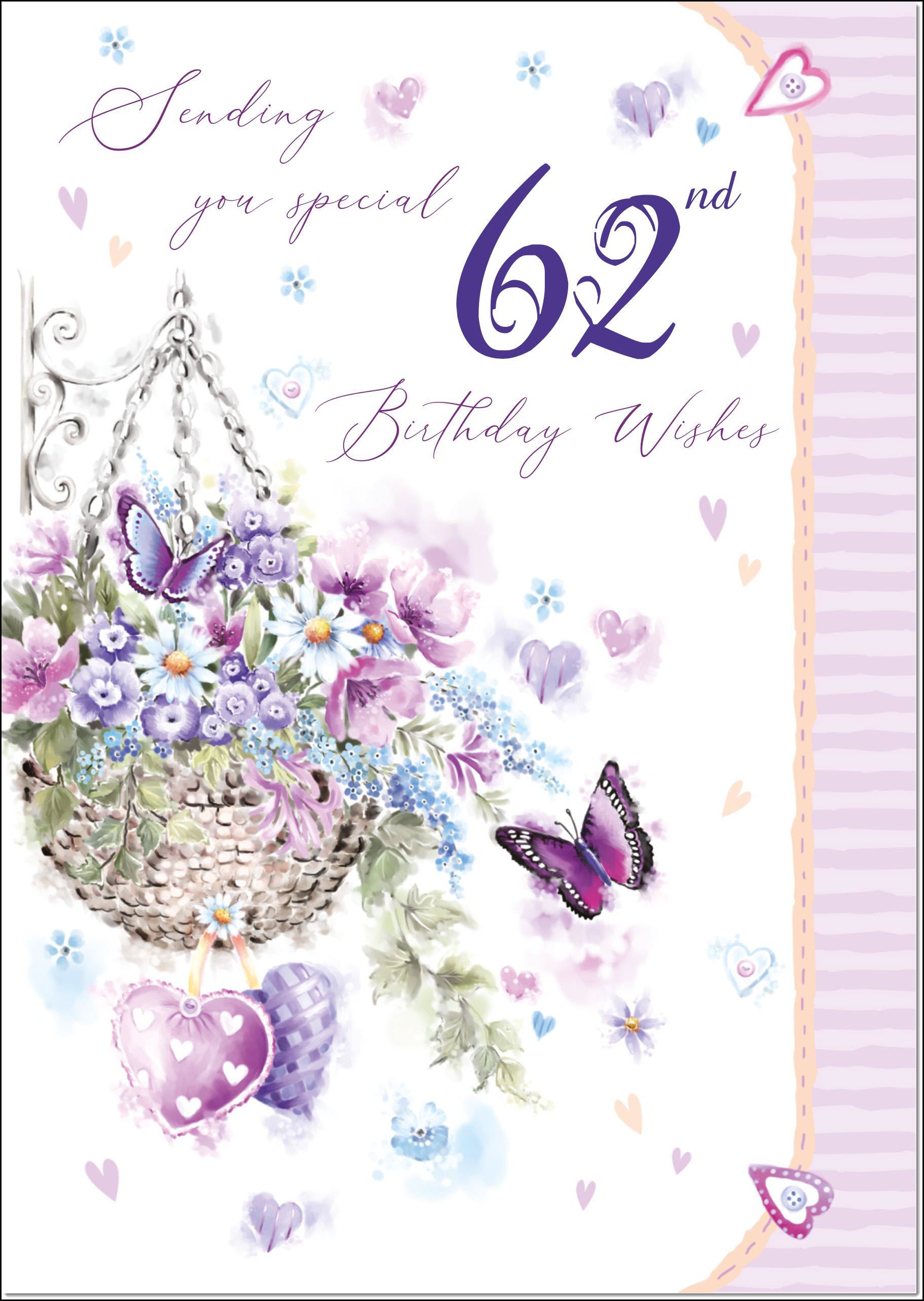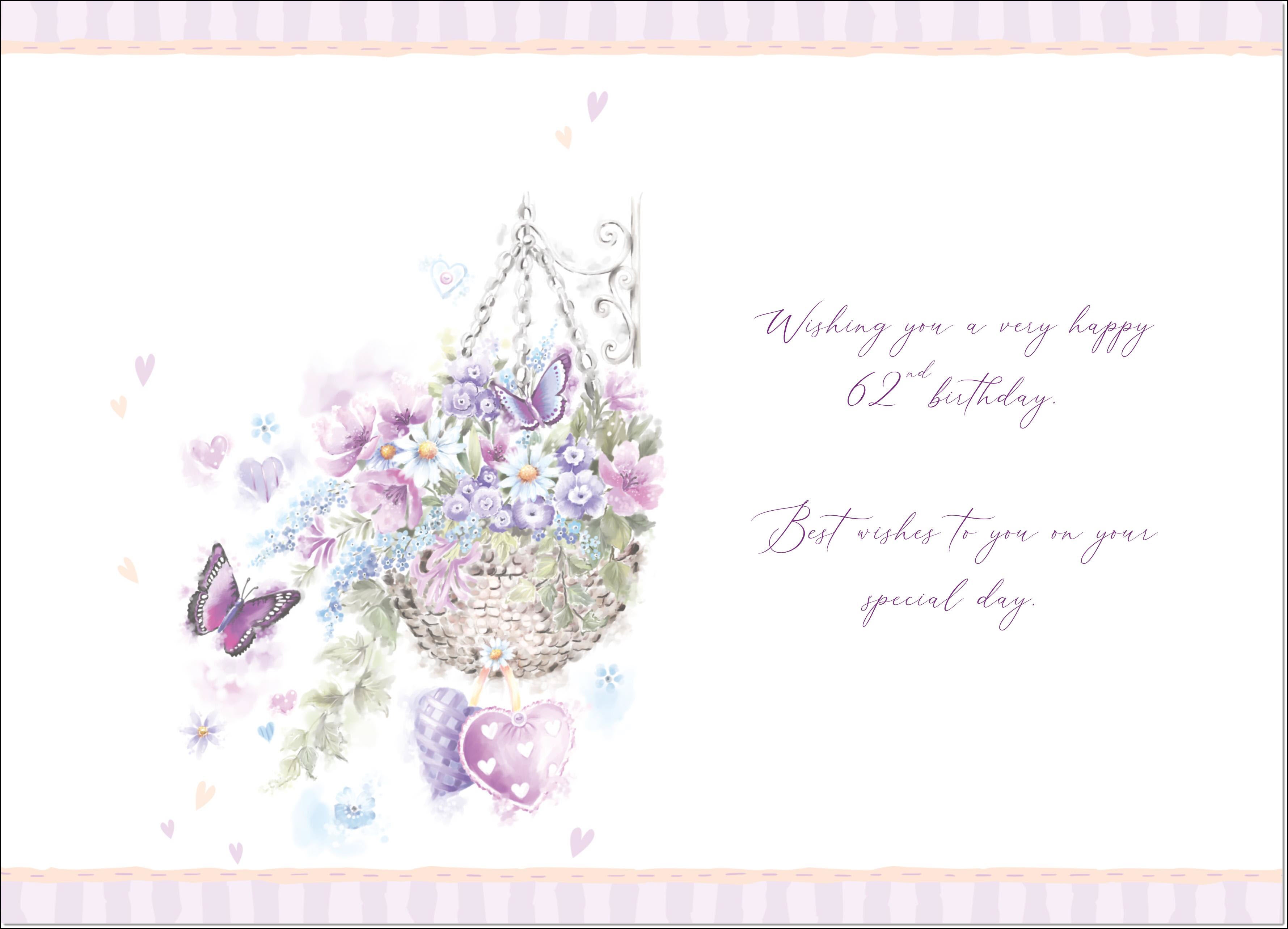62nd Birthday Card Age 62 for Her Purple Hanging Basket